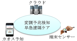 ICTとカオス解析技術、端末センサーを活用により、人々の24時間の健康状態を把握・管理、いち早く変調に気づきにより、次世代看護と健康予知の実現にしています。